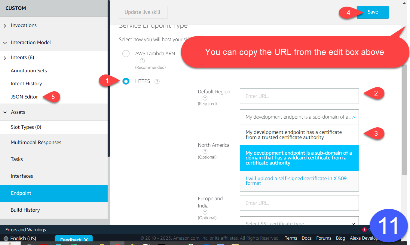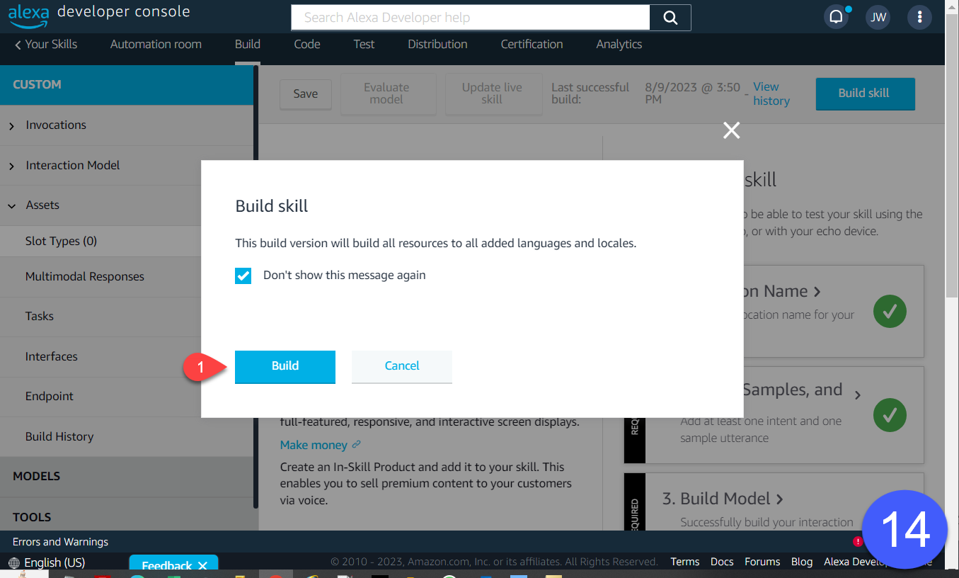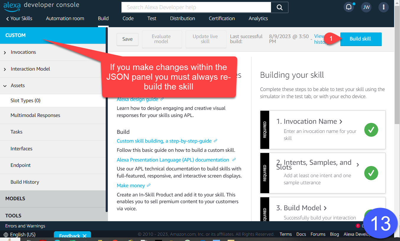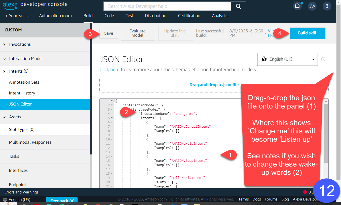 After pasting the JSON file, if you look toward the top of the panel code you will see 'Listen up' this is the default invocation words to wake this skill. You change these for whatever words you like provided that they are not Amazon 'Reserved' system words, like 'Open', 'Run', 'Ask', 'Launch' etc. You should also use words from your own language too. You can always change these later and re-build the skill.