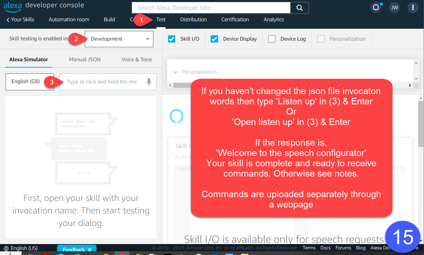 If you get a response of 'Welcome to the speech configurator' you have now completed the build of your skill. The skill now needs to have whatever commands you wish to use, uploaded into your personal data-slot. The data-slot requires a special update 'Key' which your new skill will generate for you. Follow instructions from the data_uploads page to do this and to start using some amazing command features.