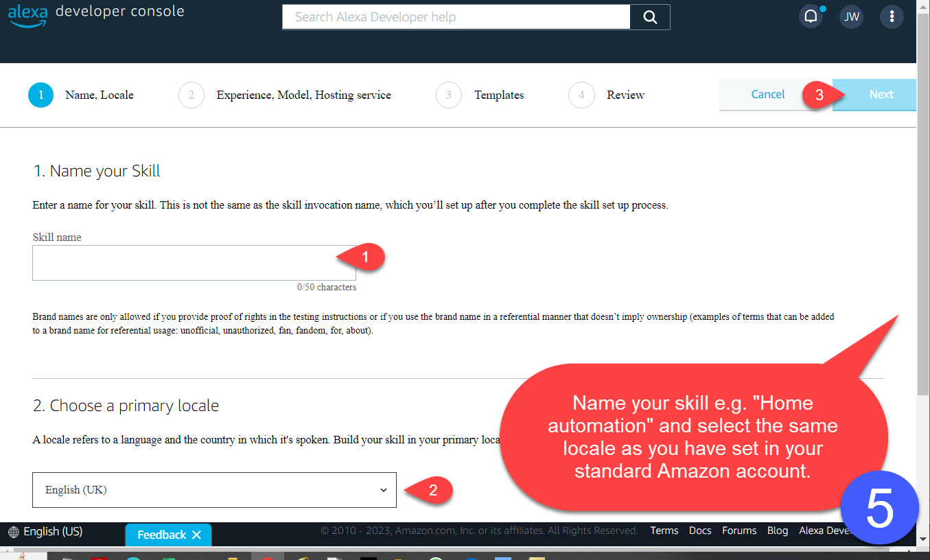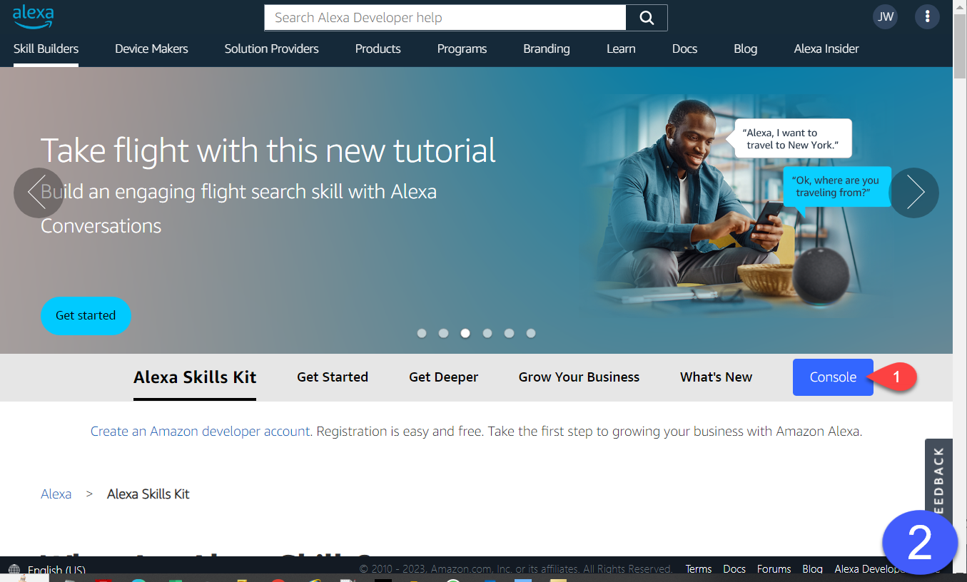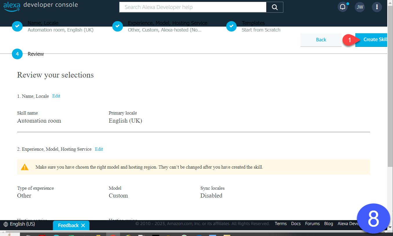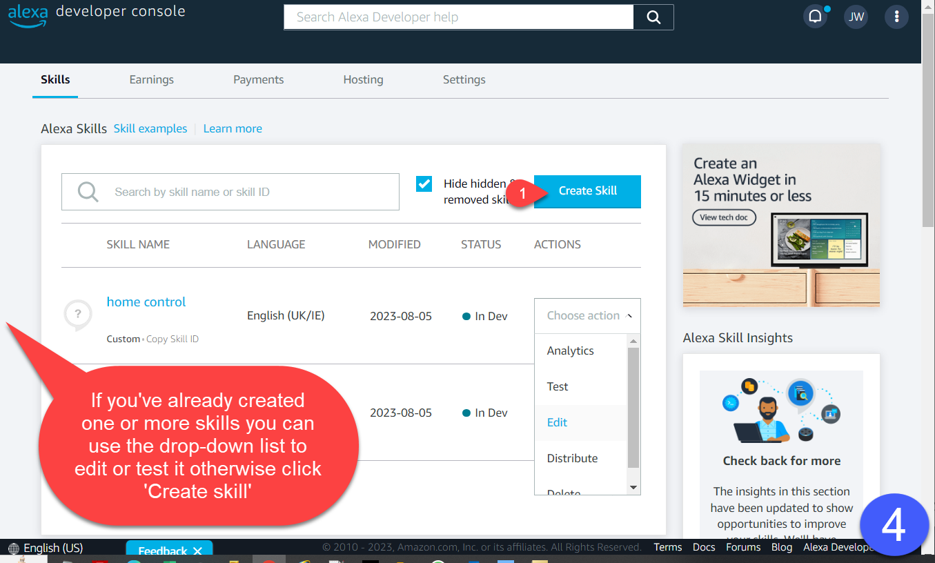 To create your own Alexa skill you will need to login to the Amazon skills developer page, you may also be prompted to register as a developer. This is without charge and you can skip over any signing up to AWS. The start page relating to this tutorial can be found here.
